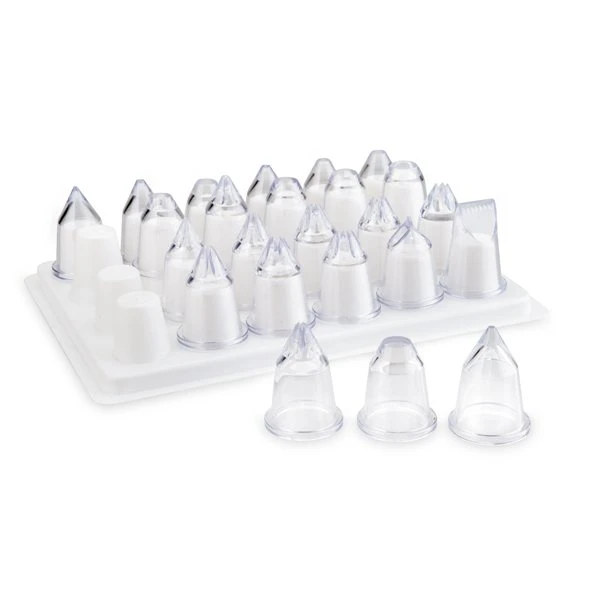 Cet assortiment de 24 douilles pour poche à douille se compose de douilles unies, douilles cannelées, douille à bûche, douille à rose et autres douilles de tailles différentes, en acrylique, qui vous aideront à fourrer et décorer toutes vos préparations, de l’entrée au dessert. Vous ferez des réalisations dignes de chefs cuisiniers !