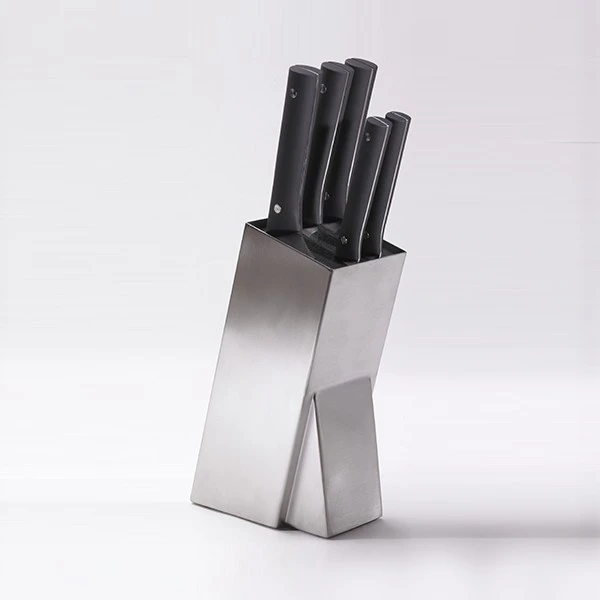 Le bloc universel en inox avec 5 couteaux de cuisine est un kit qui regroupe les ustensiles et leur moyen de rangement ! Le bloc de rangement de couteaux universel vous permet de ranger n’importe quel couteau à n’importe quelle place. Le maintien se fait par un système de fibres. Il suffit donc de planter vos couteau là ou vous voulez ! Le position inclinée du bloc est stable et permet d’attraper facilement vos couteaux.
