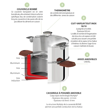 Pour rendre le tout hermétique, le cuiseur Biome Cristel possède un couvercle bombé en verre borosilicate ultra résistant, avec un thermomètre de contrôle des différentes zones de cuisson, pour une température maîtrisée. Grâce à sa forme étudiée, l’eau de condensation coule le long du couvercle et des parois pour ne pas détremper les aliments en cours de cuisson.