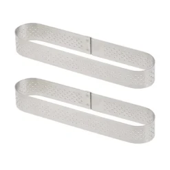 Ce lot comporte deux cercles perforé Oblong De Buyer. Créé en partenariat avec l’Ecole du Grand Chocolat Valrhona, ce cercle perforé oblong DE BUYER est constellé de trous pour une cuisson uniforme des bords de tarte. Le bord droit permet une finition impeccable des petits gâteaux comme des entremets et un démoulage facile et sûr.