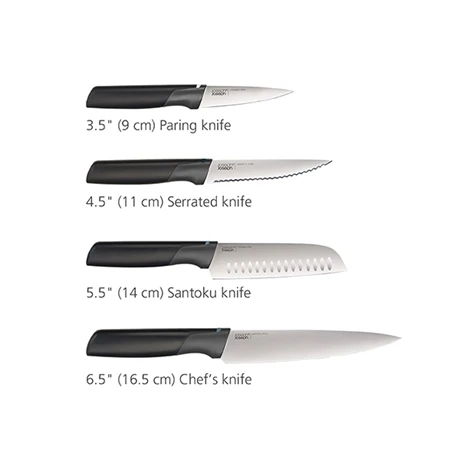 Les couteaux Elevate Joseph Joseph sont des couteaux de qualité avec une lame japonaise en acier inoxydable. Bien pensée, la partie centrale des couteaux surélève légèrement la lame pour qu’elle ne touche pas la surface de votre plan de travail lorsque vous le posez.