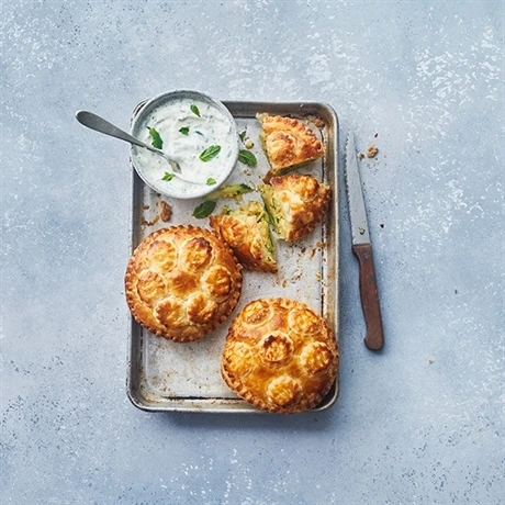 Pour utiliser le kit pour croustades garnies, il vous faudra commencer par étaler votre pâte et en étendre une moitié sur les moules, tandis que l’autre dépasse pour pouvoir être rabattue par la suite. Poussez la pâte au fond des moules pour qu’elle s’arrondisse et puisse accueillir votre farce puis remplissez vos croustades et rabattez l’autre moitié de pâte par-dessus. Il ne vous reste plus qu’à utiliser l’emporte-pièce pour découper la pâte et la souder afin que la croustade ne se rouvre pas, tout en y laissant de jolies stries sur les rebords. Enfournez les moules résistants jusqu’à 230°C, et dégustez vos croustades garnies Betty Bossi.