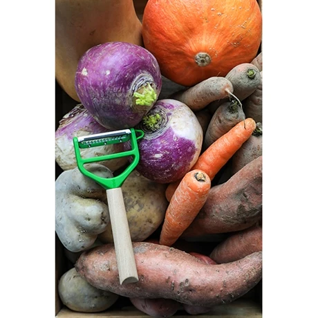 La lame permettant d’éplucher est microdentée, elle est donc efficace sur tous types d’aliments ; les tomates fragiles ou les butternuts à la peau épaisse s’épluchent sans difficulté. Ce rasoir à double lame permet également de confectionner des juliennes en tranchant finement vos aliments. Un embout enlève-yeux est fixé sur le côté pour retirer les yeux des pommes de terre. Ce couteau pratique et facile à manier est confortable aussi bien pour les droitiers que les gauchers.