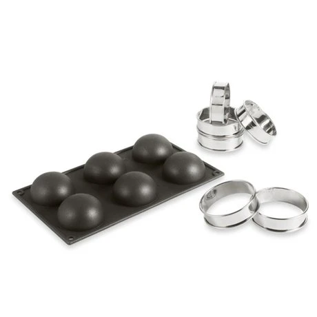 Le kit 6 cercles à tarte et moule 6 demi-sphères est parfait pour la réalisation de tartelettes individuelles avec dômes. Les ustensiles peuvent s’utiliser séparément : ainsi les cercles aident à confectionner des tartes, gâteaux, ou s’utilisent comme emporte-pièces. Les sphères permettent de créer des créations en chocolat qui serviront de contenant. En inox 18/10 et silicone, le démoulage est facile et le nettoyage se fait au lave-vaisselle.