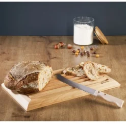 Pratique, cette planche à pain en hêtre massif de Mathon est dotée d’un fond rainuré amovible, permettant de récupérer facilement les miettes de pain. Le couteau dispose d’une lame crantée en acier inoxydable et se pose dans la planche, pour un rangement gain de place. L’hêtre, bois de qualité et huilé, se nettoie facilement et garantit une bonne durabilité dans le temps.
