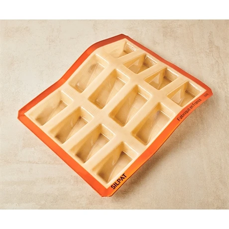 Le moule Silpat de 12 barres torsadées a des dimensions de 40 x 30 x 2,45 cm. Les 12 empreintes mesurent 10 x 4,5 x 2,45 cm ce qui est idéal comme format de goûter, d’entremet individuel ou de snacking.
